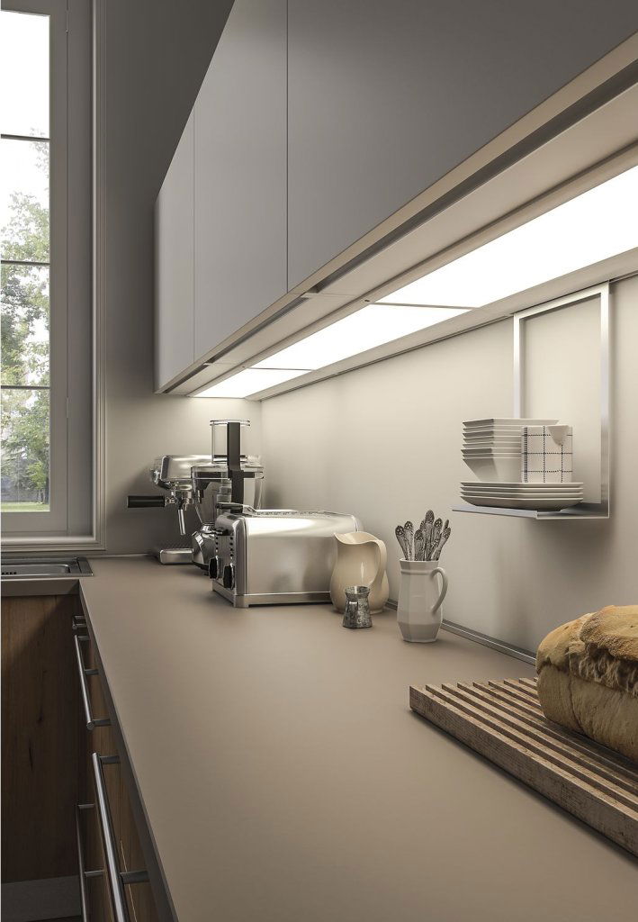 Das Linero MosaiQ System ist ein flexibles Organisationssystem für die Küchenrückwand. Es besteht aus einer stabilen Reling, die direkt unter der passenden Leuchte montiert wird.
