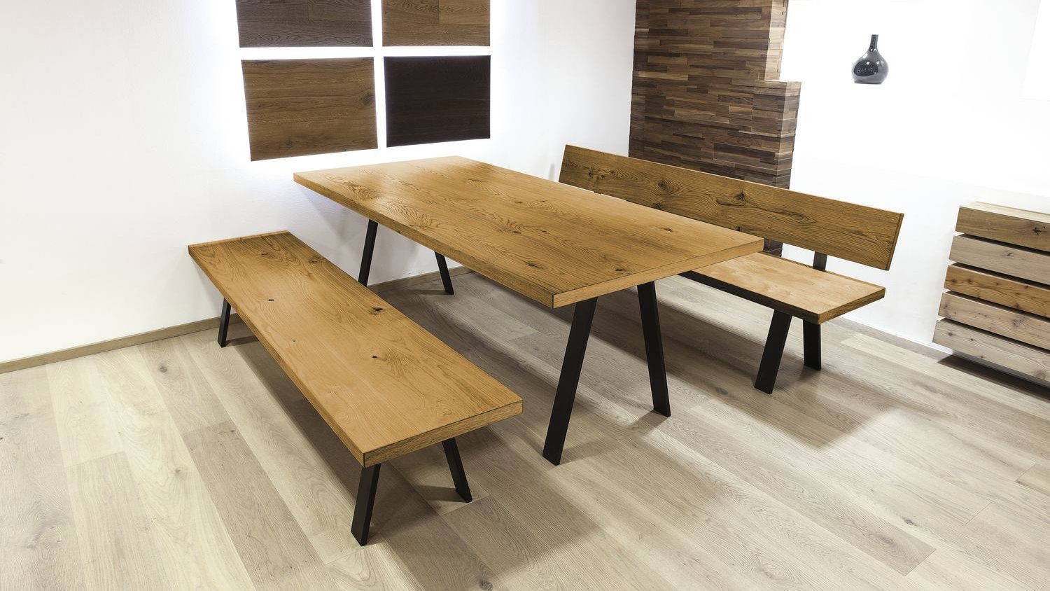 - Industrial Style: Dunkle Tischplatte aus Massivholz (z. B. geräucherte Eiche) kombiniert mit schwarzen Tischkufen aus Metall.