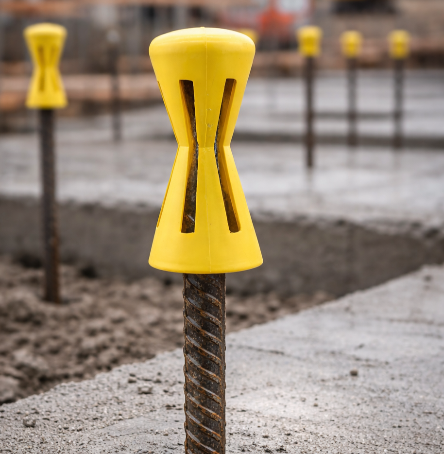 Die Schutzkappe „Flexi“ von Bemontech dient als zuverlässige Abdeckung für vorstehende Eisenenden auf Baustellen.